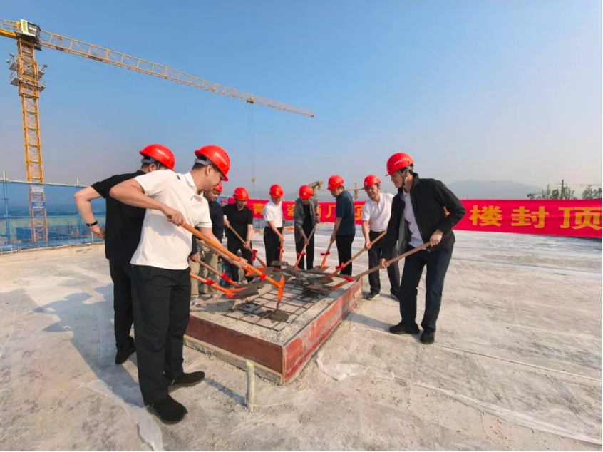 在封頂儀式現場,熱鬧非凡,鞭炮齊鳴,汾陽杏花村經濟技術開發區管委會副主任李樹盛、汾陽杏花村經濟技術開發區管委會行政審批部部長吳建華、杏花村經濟技術開發區馮郝溝村書記張小勇、青花瓷酒品牌創始人朱德寧、青花瓷酒業集團董事長兼總裁朱明、青花瓷酒業集團總經理朱明橋、中鐵五局項目部總經理楊利、山西青花瓷酒廠副總經理陳其發、山西青花瓷酒廠副總經理、總工程師郝慧敏、山西青花瓷酒廠項目總工張國誼、山西青花瓷酒廠項目副總付守申等領導共同見證了這一激動人心的時刻。自新酒廠項目啟動以來,各方齊心協力,克服了諸多挑戰,在保證工程質量與安全的前提下,穩步推進建設進度,確保了綜合樓按時封頂。